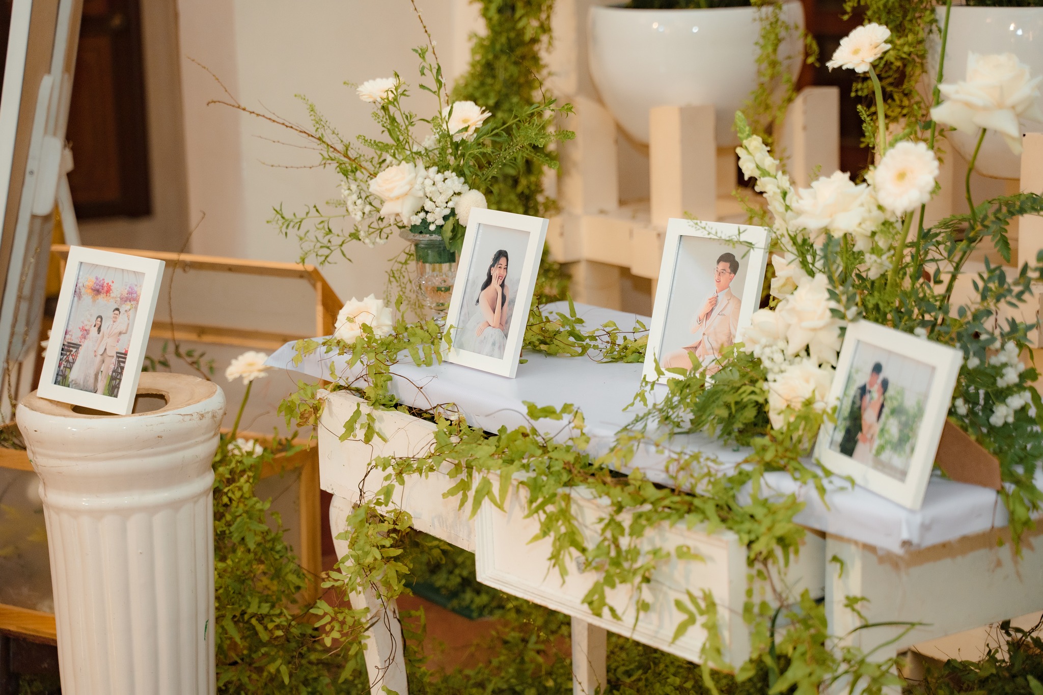 Bàn Gallery phong cách khu check-in mang đến một không gian trưng bày sáng tạo và tạo nên khu vực riêng cho khách mời chụp ảnh và ghi lại những khoảnh khắc đáng nhớ. Các khung ảnh, bảng tên, nến hoa,… được sắp xếp hài hòa và độc đáo trên bàn Gallery, tạo nên một không gian trưng bày sống động và nghệ thuật.