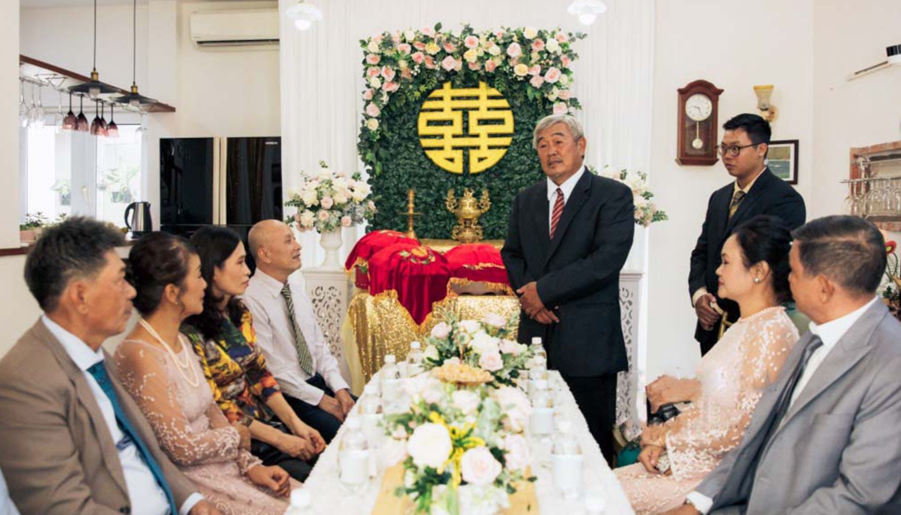 Đám cưới của người Việt không thể thiếu nghi thức dâng hương lên bàn thờ gia tiên, một hành động trọng đại mang ý nghĩa tôn kính tổ tiên. Bàn thờ gia tiên được coi là linh thiêng, vì vậy cần được trang trí đẹp mắt và trọn vẹn, thể hiện lòng thành kính của con cháu. Với mong muốn nhận được sự chứng giám và bảo hộ tốt nhất từ ông bà đối với cặp đôi mới cưới.