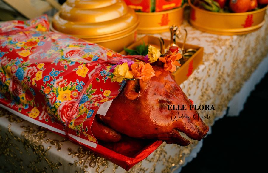 Đây là món ăn phổ biến trong ẩm thực Việt Nam và thường được bày trên mâm quả cưới hỏi. Heo quay tượng trưng cho sự giàu có, phú quý và tài lộc được xem là món ăn mang ý nghĩa tài lộc và may mắn cho đôi vợ chồng trẻ.