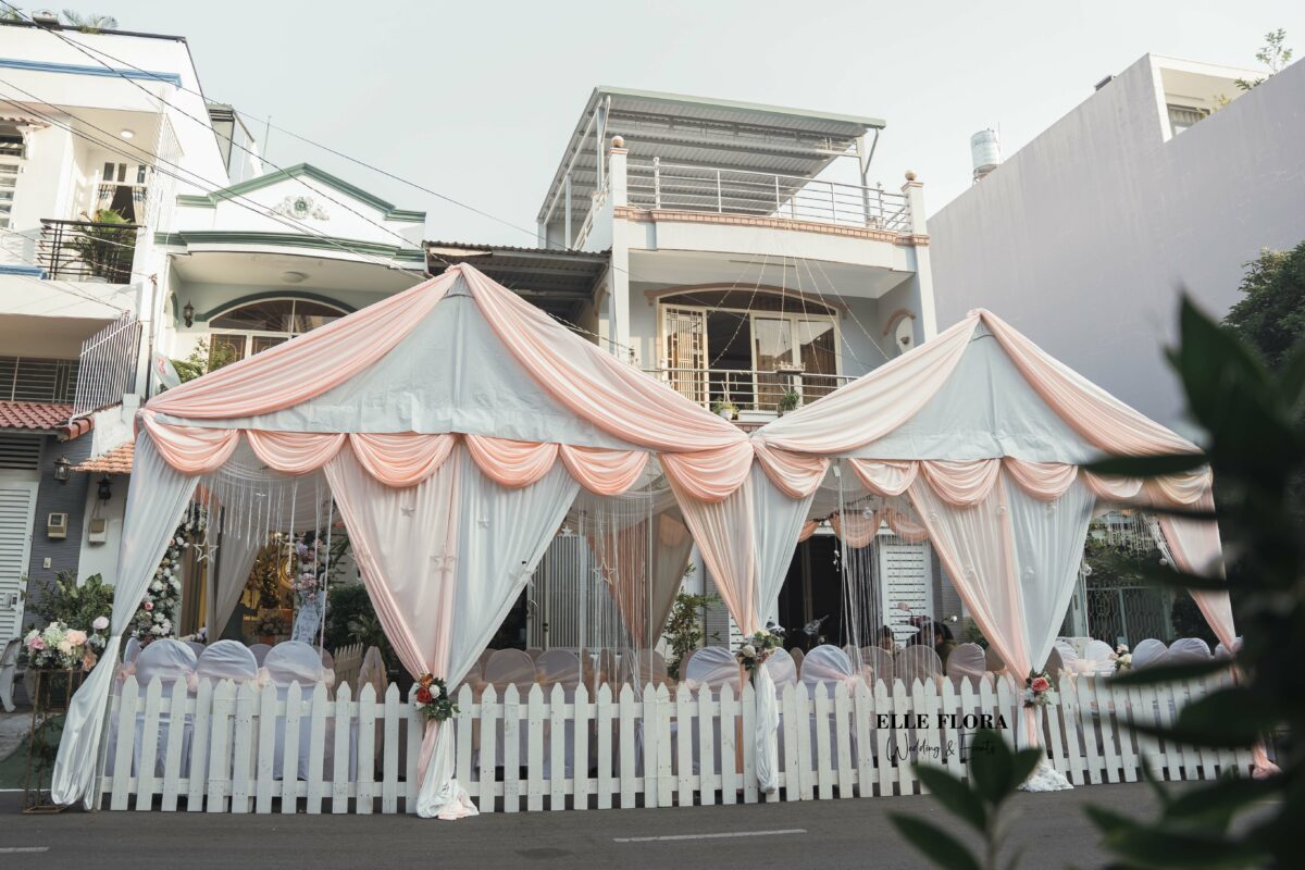 Elle Flora sẽ liệt kê 4 hạng mục chính cần chuẩn bị cho một bữa tiệc cưới tại nhà giúp bạn bao gồm cổng hoa, nhà rạp, phông nền và mâm quả.