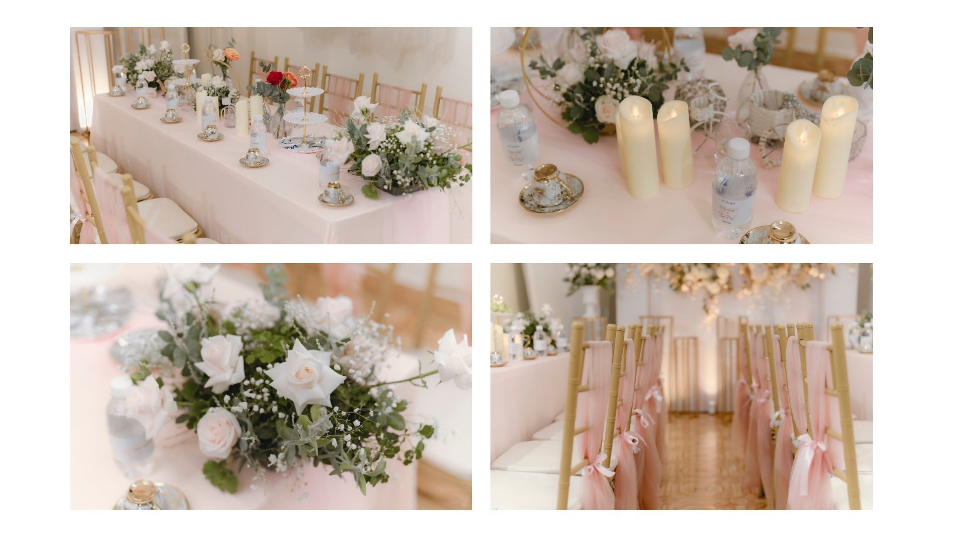 - Ghế tif: Được trang trí mỗi bên 6 ghế tif, thắt nơ voan và trang trí hoa làm điểm nhấn thêm phần sang trọng.