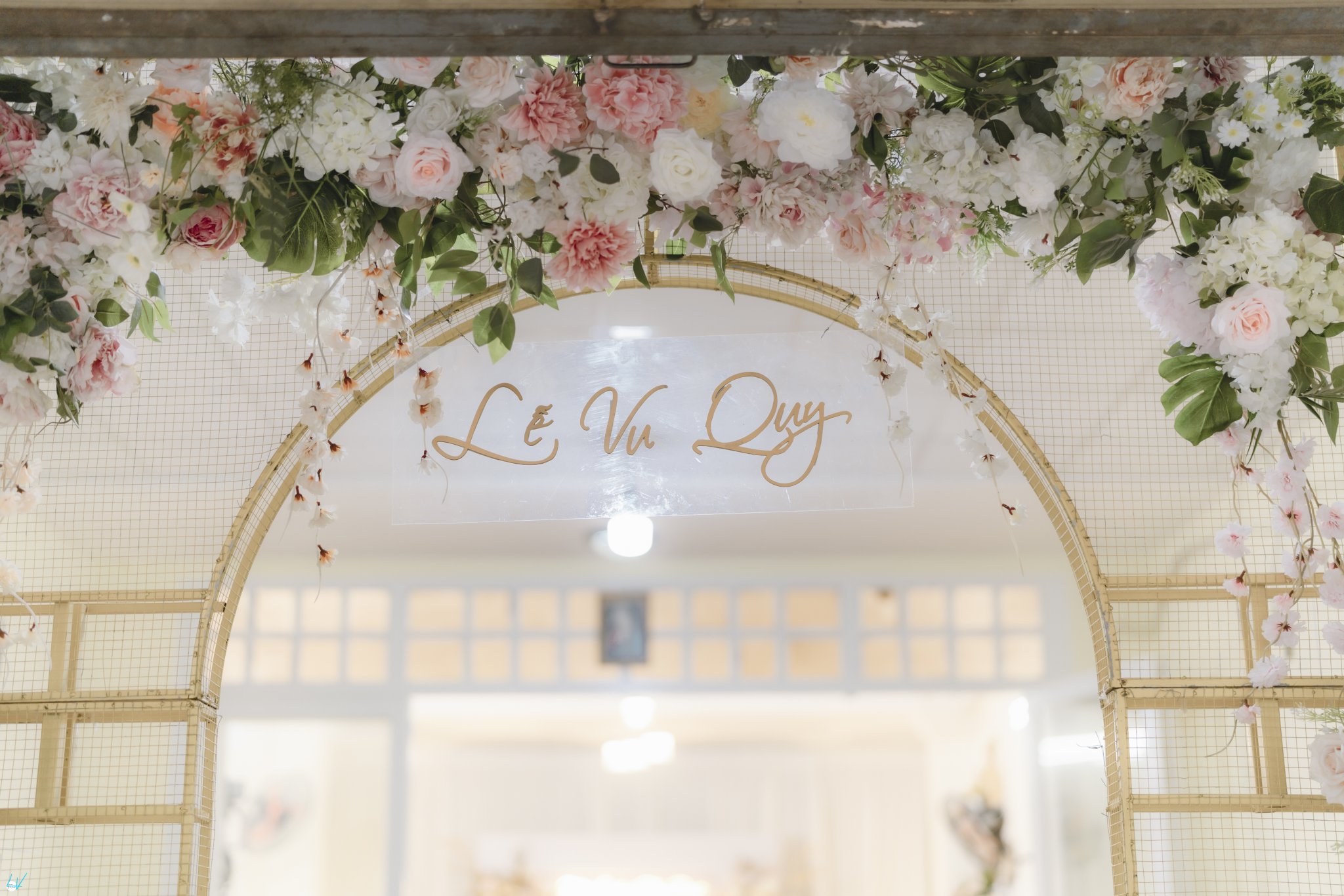 - Backdrop: được thiết kế Hiflex tone màu pastel và phối với hoa Hồng 2 bên và lá vàng tạo nên backdrop cực ấn tượng, hiện đại và cuốn hút.