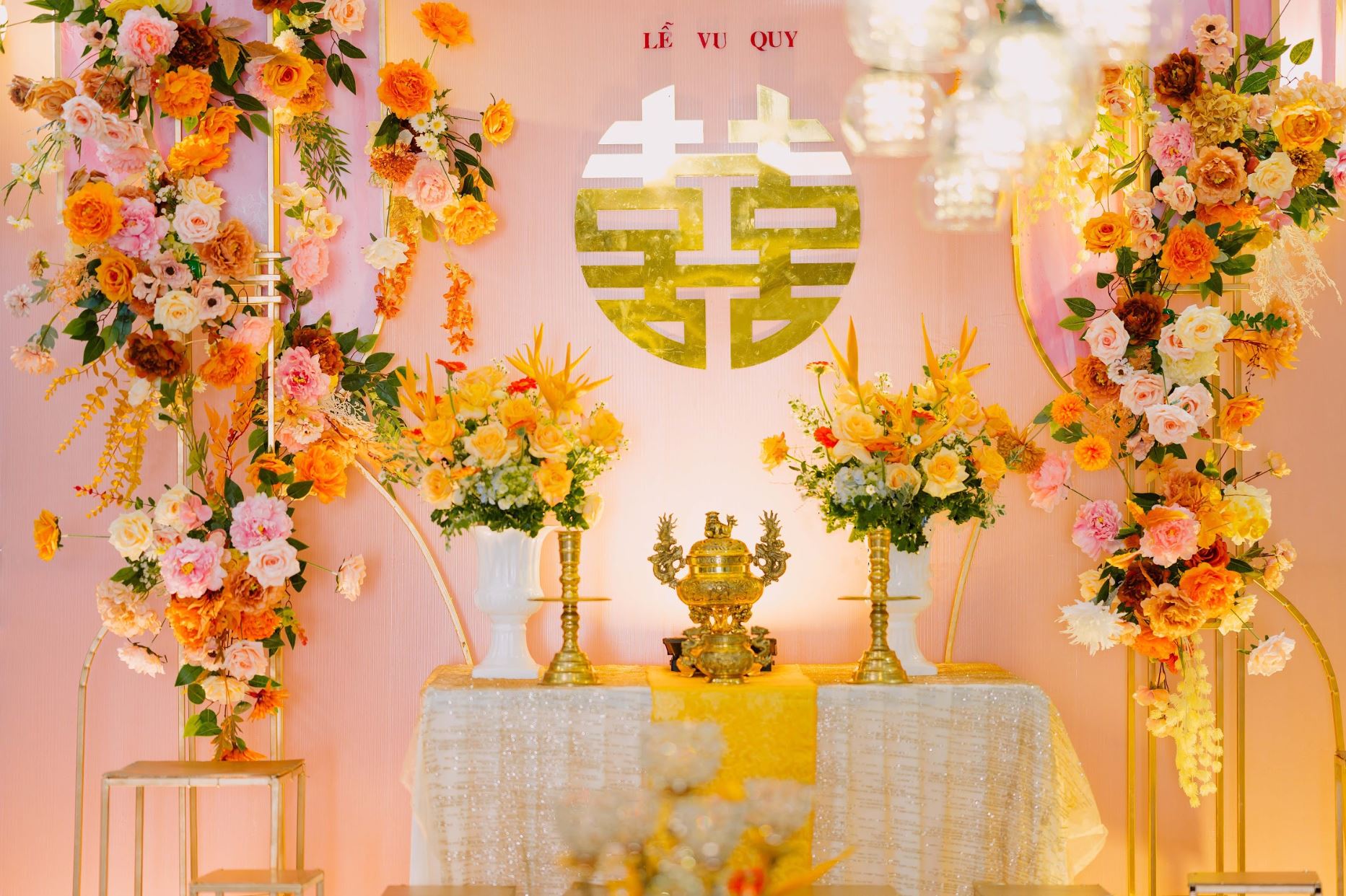 Màu vàng kim với vẻ đẹp quyến rũ tạo nên không gian đầy sang trọng cho đôi uyên ương. Trang trí bàn thờ gia tiên với màu vàng kim sẽ nổi bật và tôn lên sự sang trọng của gia chủ. Tone màu vàng cùng với phông nền, vật dụng ánh kim và hai bình hoa đỏ, bàn thờ gia tiên sẽ trở thành điểm nhấn sang trọng, đẳng cấp, gây ấn tượng mạnh đối với khách mời. Đặc biệt, dùng màu vàng kim là màu cầu chúc một tình yêu bền vững chung thủy cho cặp đôi mới cưới.