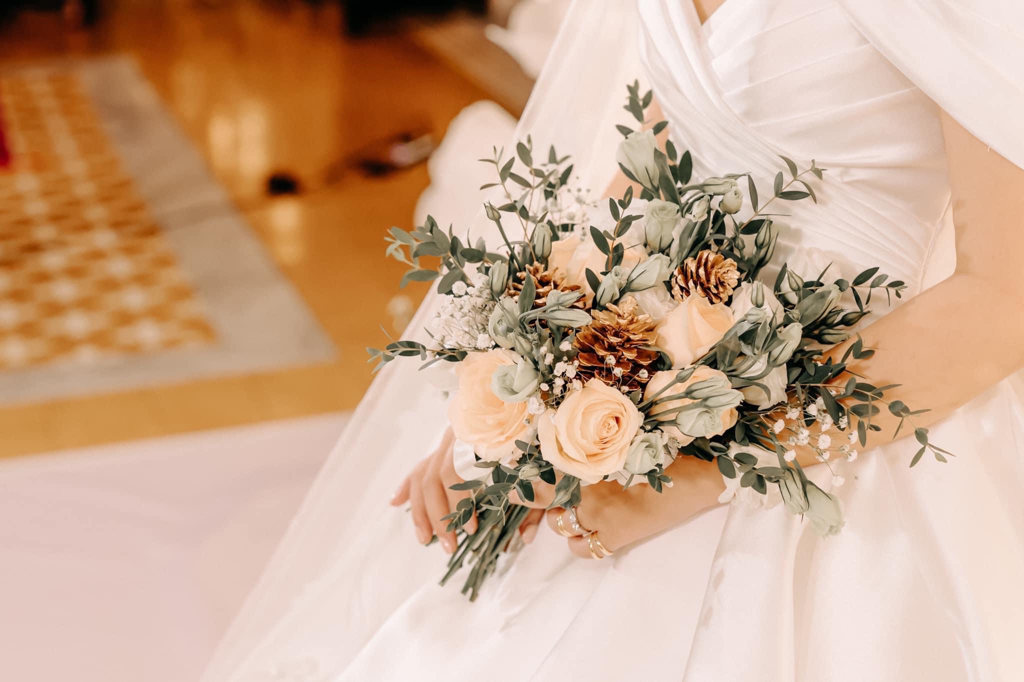 Hoa cầm tay là phụ kiện quan trọng, không chỉ giúp tô điểm vẻ đẹp của cô dâu, mà còn mang ý nghĩa tượng trưng cho tình yêu chung thủy của đôi vợ chồng trẻ. Các cô dâu thường chọn những loài hoa đẹp như hồng, cẩm chướng, ly, lan... cho lễ cưới. Nhưng để có được một bó hoa cầm tay ưng ý, cô dâu phải chi ra một khoản chi phí vì giá của bó hoa phụ thuộc vào loại hoa, số lượng, kích cỡ và cách bó. Hoa tươi thường đắt hơn hoa giả, nhưng mang đến cảm giác sang trọng và lãng mạn hơn.