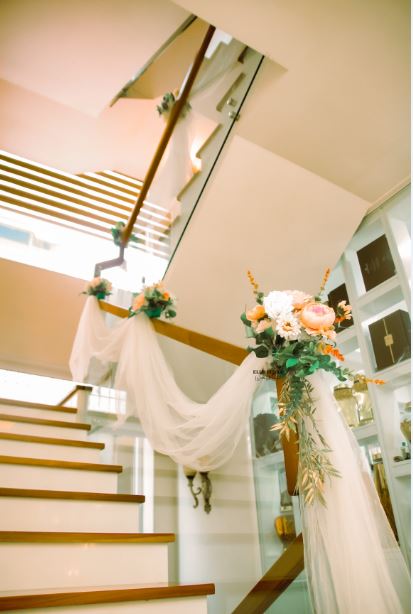 Trang trí cầu thang là một trong những dịch vụ phát sinh được nhiều cặp đôi lựa chọn để làm nổi bật không gian lễ cưới. Cầu thang là nơi quan trọng và thường thu hút sự chú ý của khách mời khi bước vào không gian tổ chức đám cưới. Vì vậy, trang trí cầu thang sẽ giúp tăng thêm vẻ đẹp và tạo ấn tượng tốt cho khách mời. Cô dâu chú rể có thể lựa chọn nhiều cách trang trí cầu thang như sử dụng hoa tươi, vải lụa, ruy băng, đèn trang trí... giúp cầu thang trở nên lộng lẫy và phù hợp với tổng thể không gian lễ cưới.