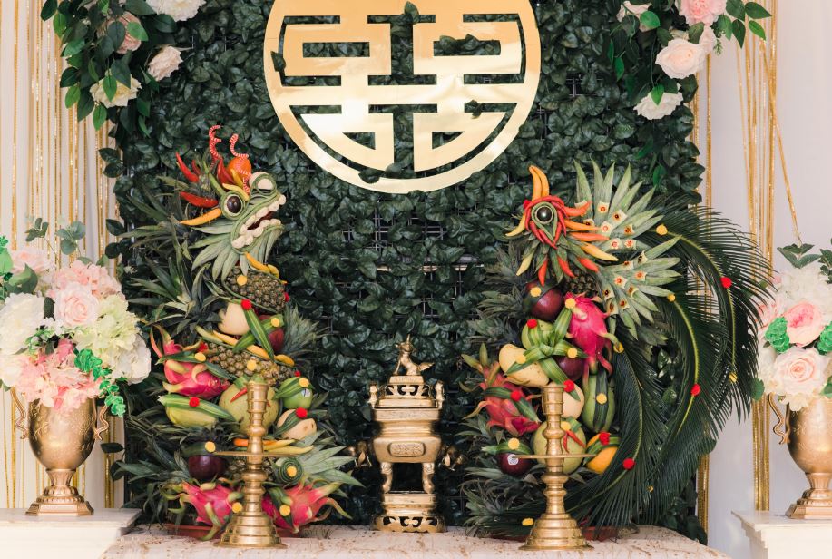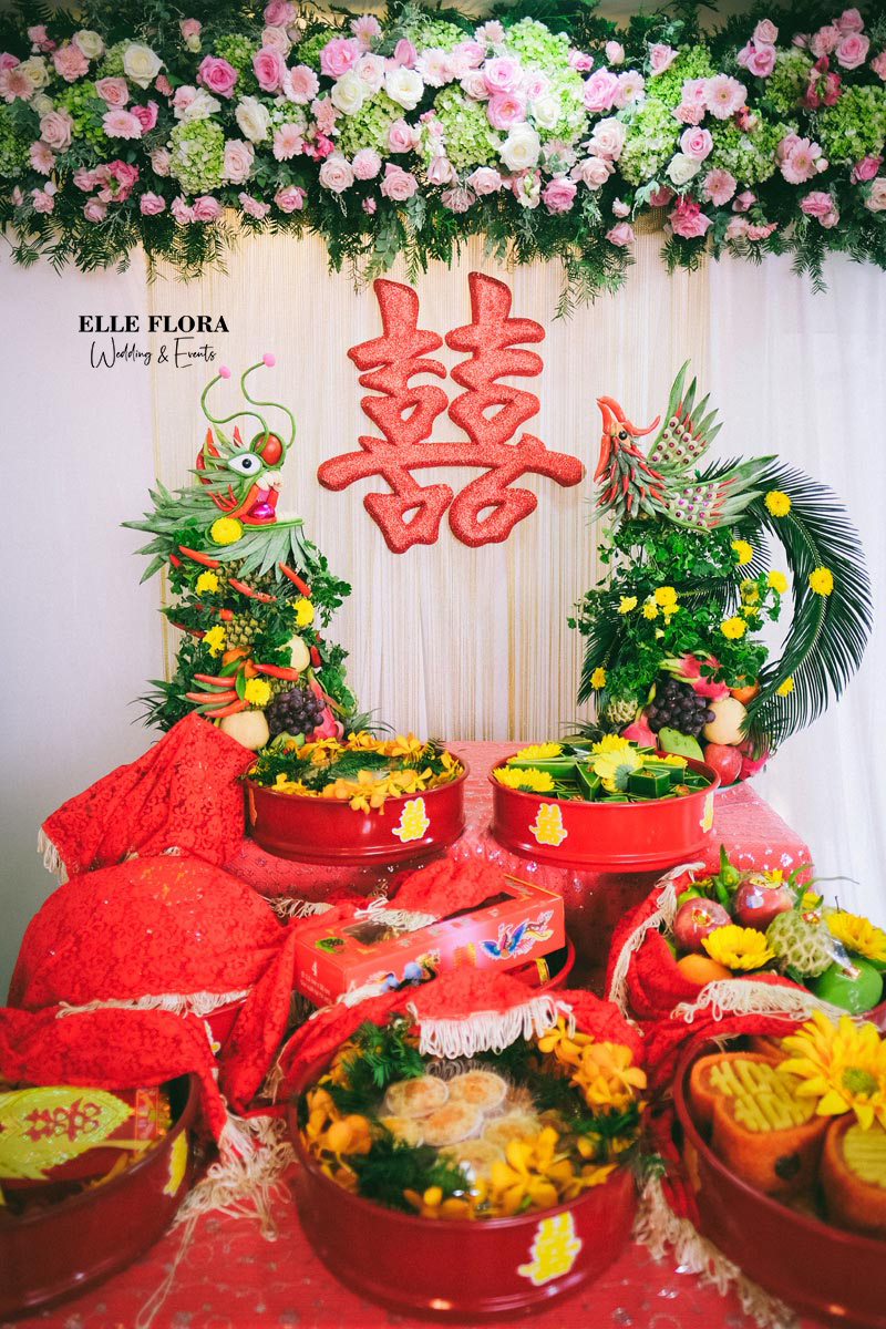 Long phụng trái cây là cách tạo điểm nhấn độc đáo và ấn tượng trong trang trí đám cưới Việt Nam. Không đơn giản chỉ là một mâm quả thông thường, long phụng trái cây mang ý nghĩa cho sự sum vầy và hạnh phúc của đôi vợ chồng mới cưới. Tuy nhiên, chi phí chuẩn bị khá cao. Ngoài giá trị của các loại trái cây được sử dụng, cô dâu chú rể cần chú ý đến chi phí thuê người tạo hình, trang trí, vận chuyển và bảo quản.