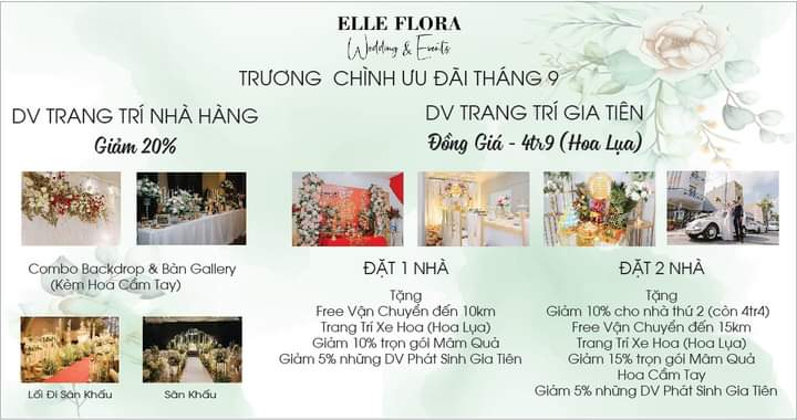 Mở màn ưu đãi đầu tháng 9, Elle Flora đưa ra nhiều ưu đãi cực hot hứa hẹn mang đến cho bạn một buổi lễ tiệc cưới đong đầy hạnh phúc.
